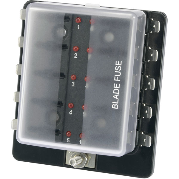 Multi (10) fuse holder for ATOF fuses (up to 30A). comes with LED indication of failed fuses. 6.35mm spade outputs. Fuse series rated for upto 32VDC |